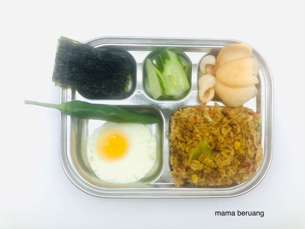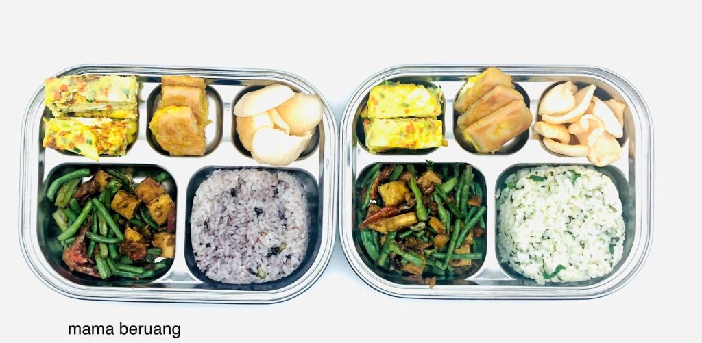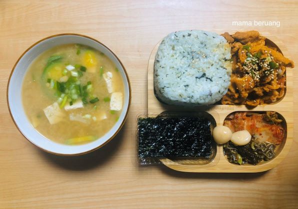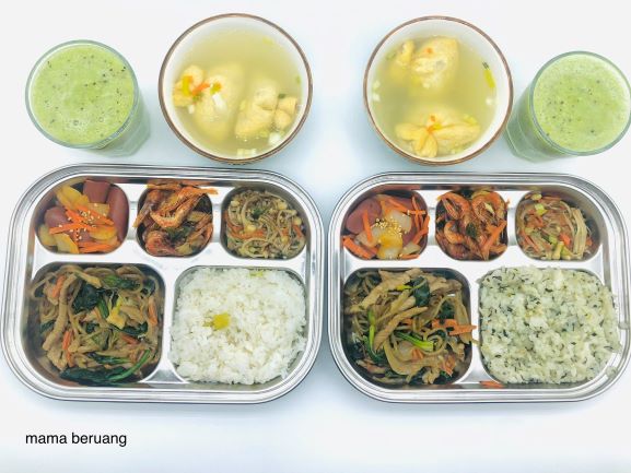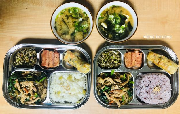 Hore tempat dosirak yang aku pesen udah dateng! Ini terbuat dari stainless steel, jadi awet. Kemudian menurutku lebih mudah juga buat nata side dish jadi ga kebanyakan piring keluar (riweuh cucinya 😥 ). Nah menu kali ini lengkap mulai dari lumpia, ham, tumis teri, japchae dan sup miso. Nasinya seperti biasa aku selalu masak sekalian dan ditaruh di freezer. Punyaku isinya campuran kentang sama ketela, kalo punya dia isinya campuran ketan hitam, ketan putih sama kacang polong.