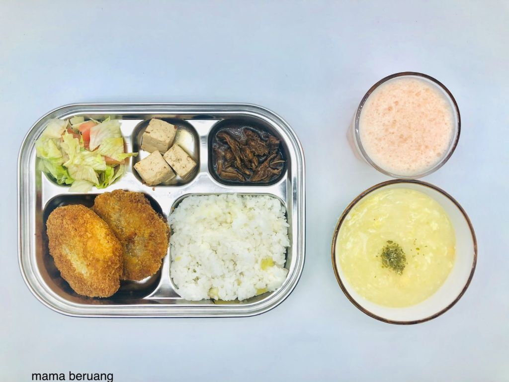 Kali ini nyoba foto 1 piring aja plus resizenya yang nggak terlalu kecil biar gambarnya lebih kelihatan 😀 . Hari ini bikin menchi katsu ditambah salad, tahu dan suwiran sapi berbumbu. Kebetulan irisan tomat buat salad sisa jadi sekalian dibikin jus. Sisa telur buat balut menchi katsu dimasukin ke sup krim jagung kepiting. Yesss…nggak ada bahan kebuang jadinya ya 😀 .