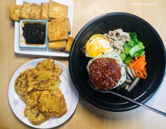 Menu : Jin ramen pedas + Bibimbab. Side dishnya tahu goreng dan bakwan sayur cocol di sambel kecap. Btw di dalem bakwan sayurnya ada udang beberapa biji yang ga kelihatan hehehe… 😀 . Tadinya mau foto barengan tapi berhubung suami udah laper bibimbabnya udah keburu diaduk-aduk sama dia hahahaha….