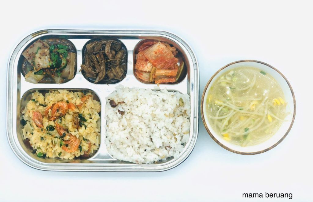 Menu hari ini sangaatttt sederhana. Yang aku bikin cuma salad sama sup aja. Sisanya semua side dish udah ready dari sebelumnya. Kebetulan udang kering bumbu itu bisa tahan cukup lama. Sedangkan jorim memang sekali bikin agak banyak supaya nggak rugi (maklum rebusnya lumayan lama). Dari daging jorim yang aku beli padahal cuma masak setengahnya. Sisanya aku bagi 2, masukin gukbab kemarin dan masih ada sisa lagi buat next. Tadinya capek banget udah kepikiran buat delivery, tapi inget-inget lagi tujuan berhemat jadinya bikin yang simple aja.
