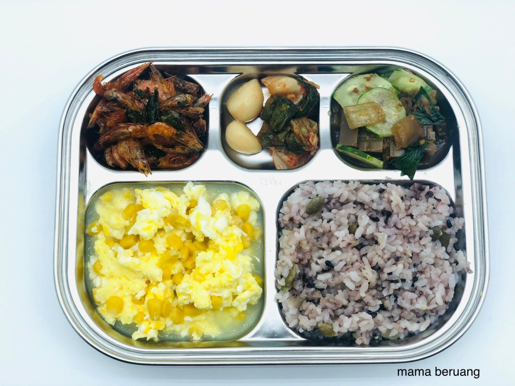 Sorenya cuma masak telur rebus ditabur jagung aja. Side dish lainnya sudah ada. Sedangkan aku sendiri makan nasi lalapan bebek dari warung yang aku pesen sekalian pas beli bakso. Karena kalap lihat ini itu, abis makan bakso aku pesen lalapan bebek, tempe mendoan sama peyek wakakaka. Totalnya abis 23,000 Won. Lumayan yaaaa….. 😥 .